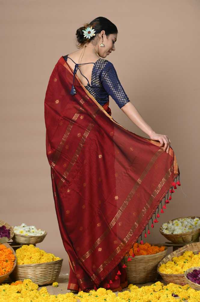 Explore our "Crimson Red VMI Design" saree, made from pure handloom Mul Cotton. This saree showcases a sleek border and lovely floral motifs on a vibrant red background. Whether it's for everyday wear or special occasions, this saree is an ideal choice. It includes an unstitched blouse in a matching silk blend with an appealing geometric pattern. Enhance your style with this classic and versatile outfit.