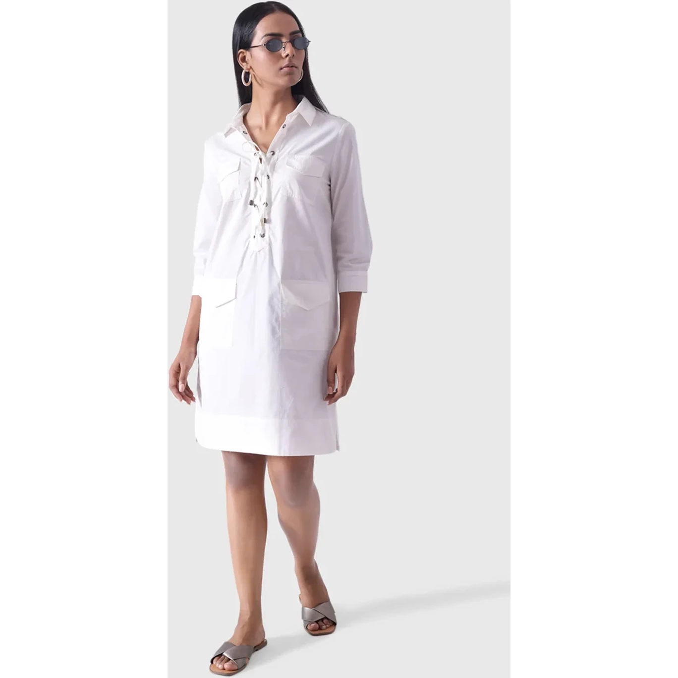 The elegant Tiffany dress has a wrap around silhouette that fastens with self fabric ties to cinch the waist The shirt collar adds a formal touch Perfect for a lunch soiree and a cocktail party
