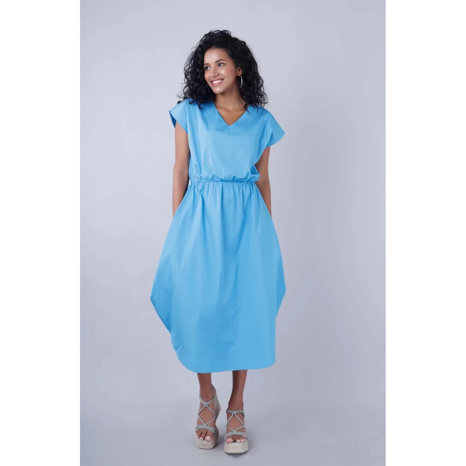 This elegant royal blue dress features a high low hemline creating a sophisticated tail effect It has a collared neckline and button details down the front giving it a classic shirtdress style The long sleeves come with adjustable button cuffs Paired with white heels this dress is perfect for formal or semiformal occasions combining timeless style with a modern twist