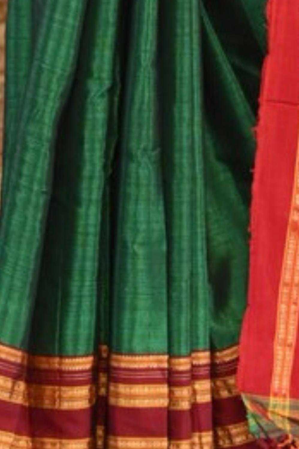 Introducing our Dark Green Handloom Cotton Silk Ilkal Saree, a beautiful saree crafted from pure handloom cotton silk fabric in a rich green hue. This saree features an exquisite designer weave with a temple border design, making it suitable for various occasions, including daily wear, festive celebrations, and ceremonial gatherings. The saree comes with an unstitched blouse piece made from complementary cotton silk fabric, allowing you to customize your blouse style. Elevate your fashion with this elegant saree featuring an elegant geometric pattern, perfect for adding a touch of charm to your wardrobe.