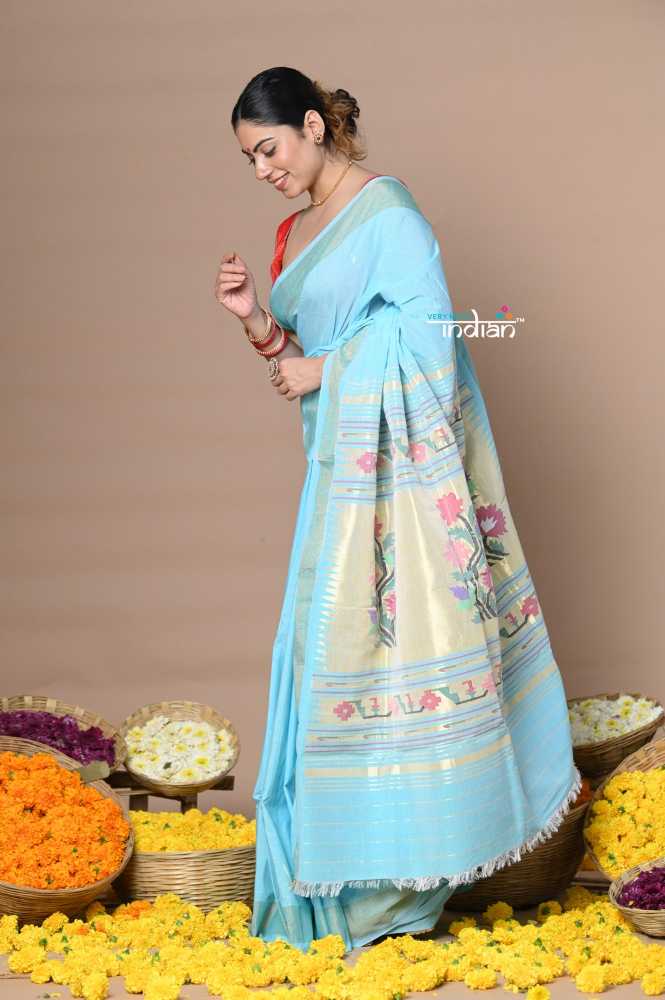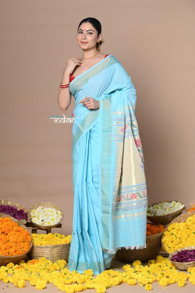 Elevate your look with our "Blue Pure Cotton Paithani Saree with Traditional Pallu." This saree features a soothing sky blue hue and showcases a Traditional Paithani Weave with an Asawali Pallu embellished in intricate Zari work, reflecting India's rich heritage. Ideal for festivals and special occasions, it includes an unstitched blouse in a matching silk blend fabric with an elegant geometric pattern. Embrace traditional beauty with this classic outfit, perfect for those who appreciate heritage designs.
