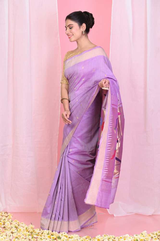 Our "Lavender Pure Cotton Paithani Saree" is a graceful choice in a lovely lilac shade. It features the traditional Paithani weave with a charming Parrot Pallu design, enhanced by intricate Zari work. Perfect for festive and ceremonial gatherings, this saree comes with an unstitched blouse in a complementing Silk Blend, ensuring you're elegantly dressed for any occasion.